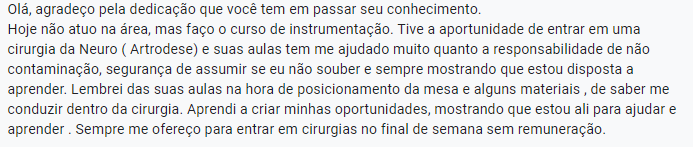 Se tornou uma das maiores referência do Brasil nesse tema da INSTRUMENTAÇÃO CIRÚRGICA, com uma canal no youtube com mais de meio milhão de visualizações com seus vídeo vem ajudando e mostrando que atuar em cirurgia não é o monstro que parece ser.